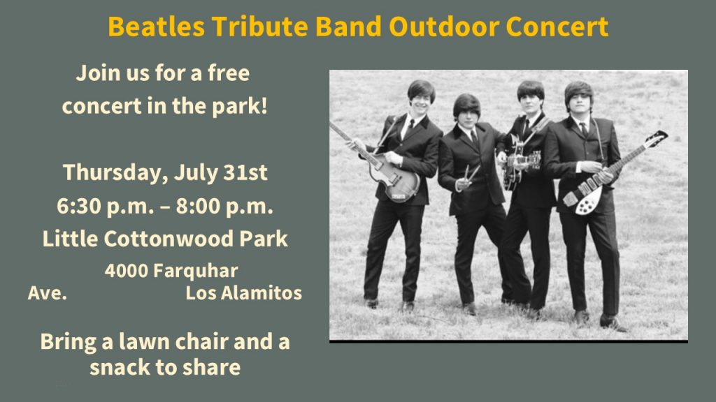 You are invited to join in the fun! Pack your own cold beverages, bring a snack to share, grab your lawn chair, and come on out to Cottonwood Park in Los Alamitos for a Beatles cover band! A few of us will get there early and find a nice spot for us all, look for the balloons. We can sit together and enjoy a fun night of music and friendship!