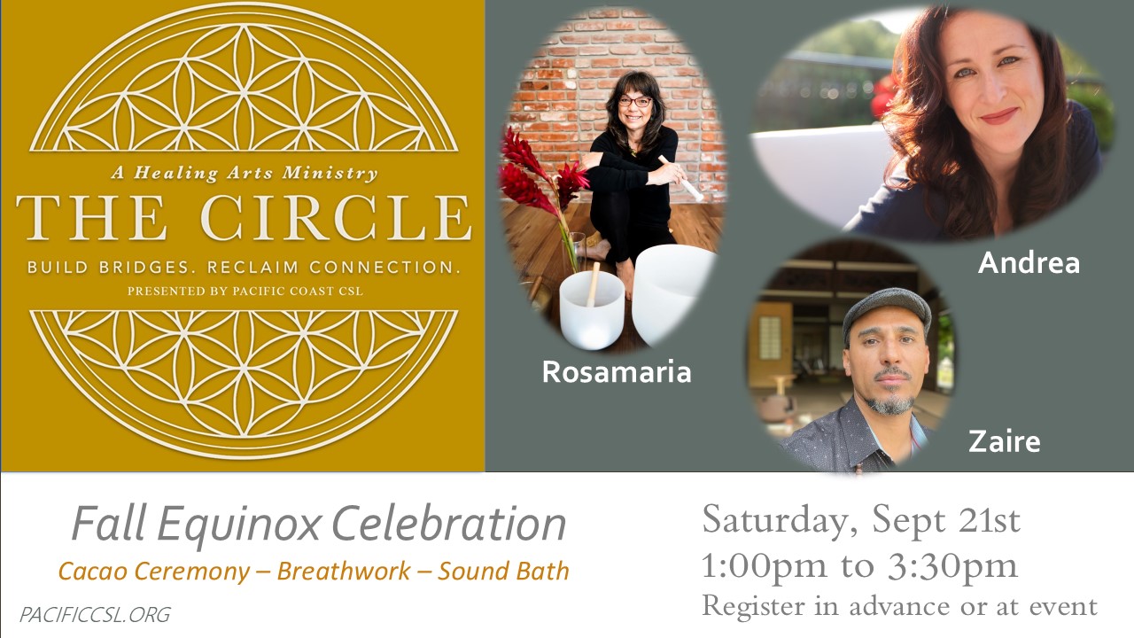 The Circle invites you to join us for a Fall Equinox Celebration on Saturday September 21st. Licensed therapist and Pacific Coast congregant Andrea Cairella has put together a fabulous afternoon for us starting off with an Invocation of the Cacao Ceremony and conscious embodiment. Then breathwork facilitator Zaire will lead a conscious connected breathwork ceremony,...