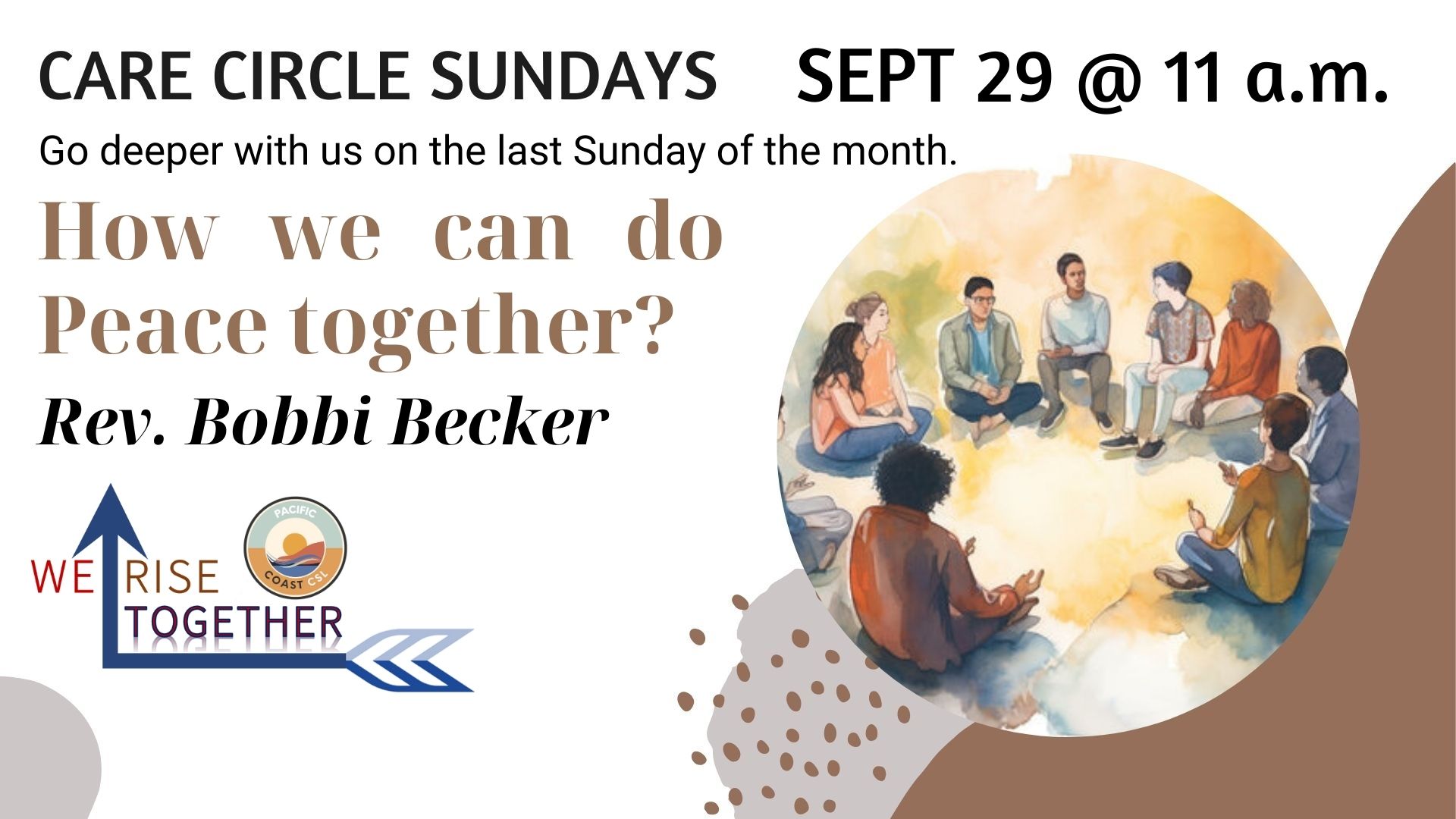 Rev. Bobbi Becker We are the Ones we have been waiting for! Not anyone else. When we consciously choose Peace, Peace will manifest in our personal lives and in the world. If you wish to participate in the Circle Care Sunday on Zoom, please use the link below: